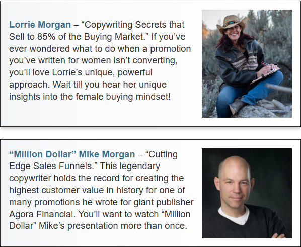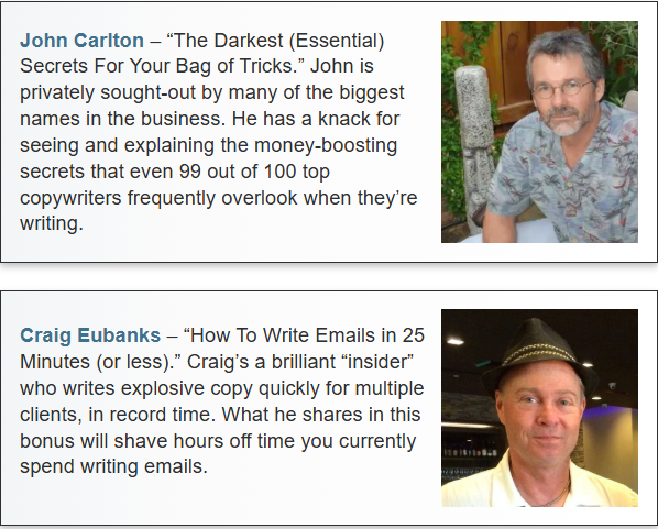 You could pay up to $2500 for one hour of their time. Just one of them! But their power-packed, no-holds-barred sessions (also online) come as part of the High-Speed Copywriting package: